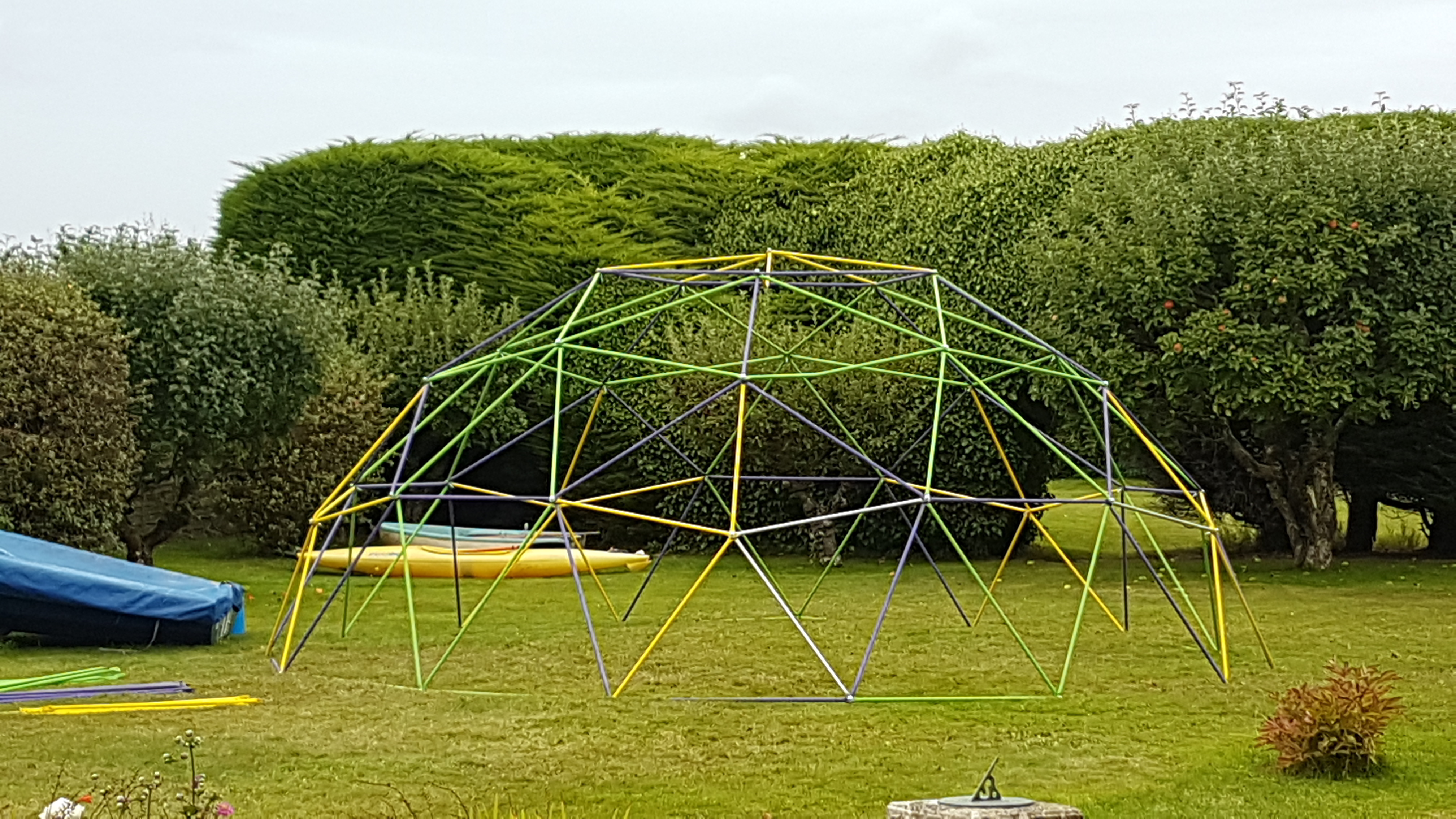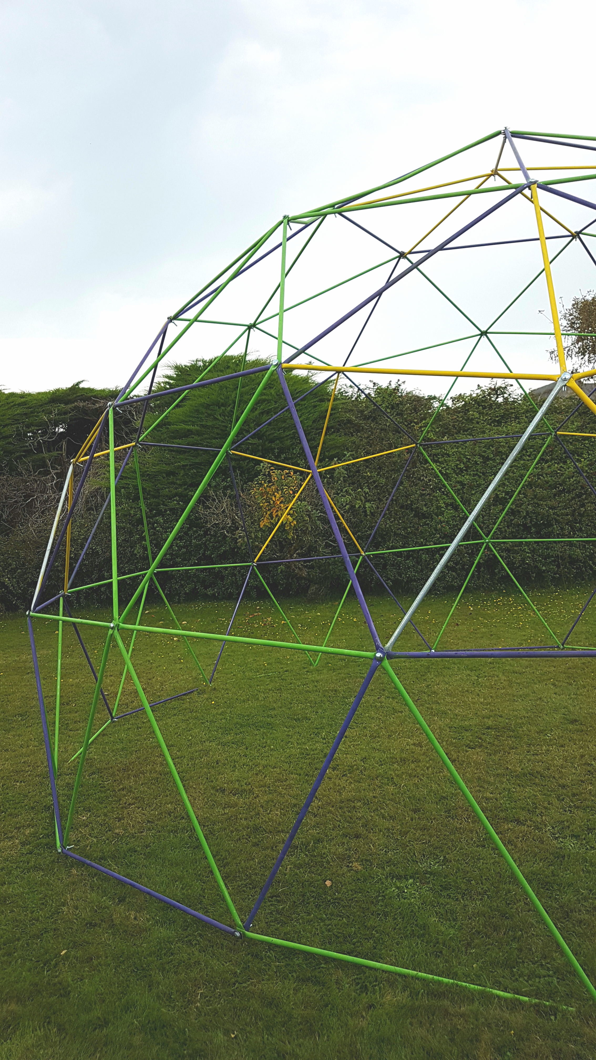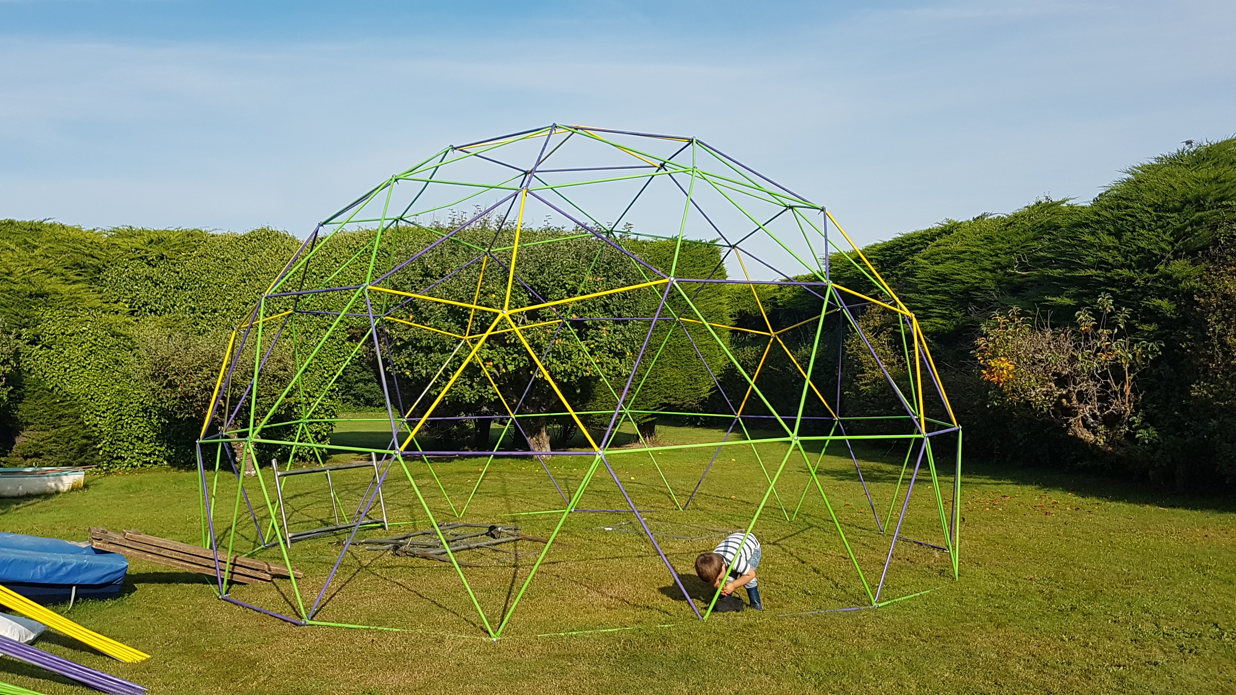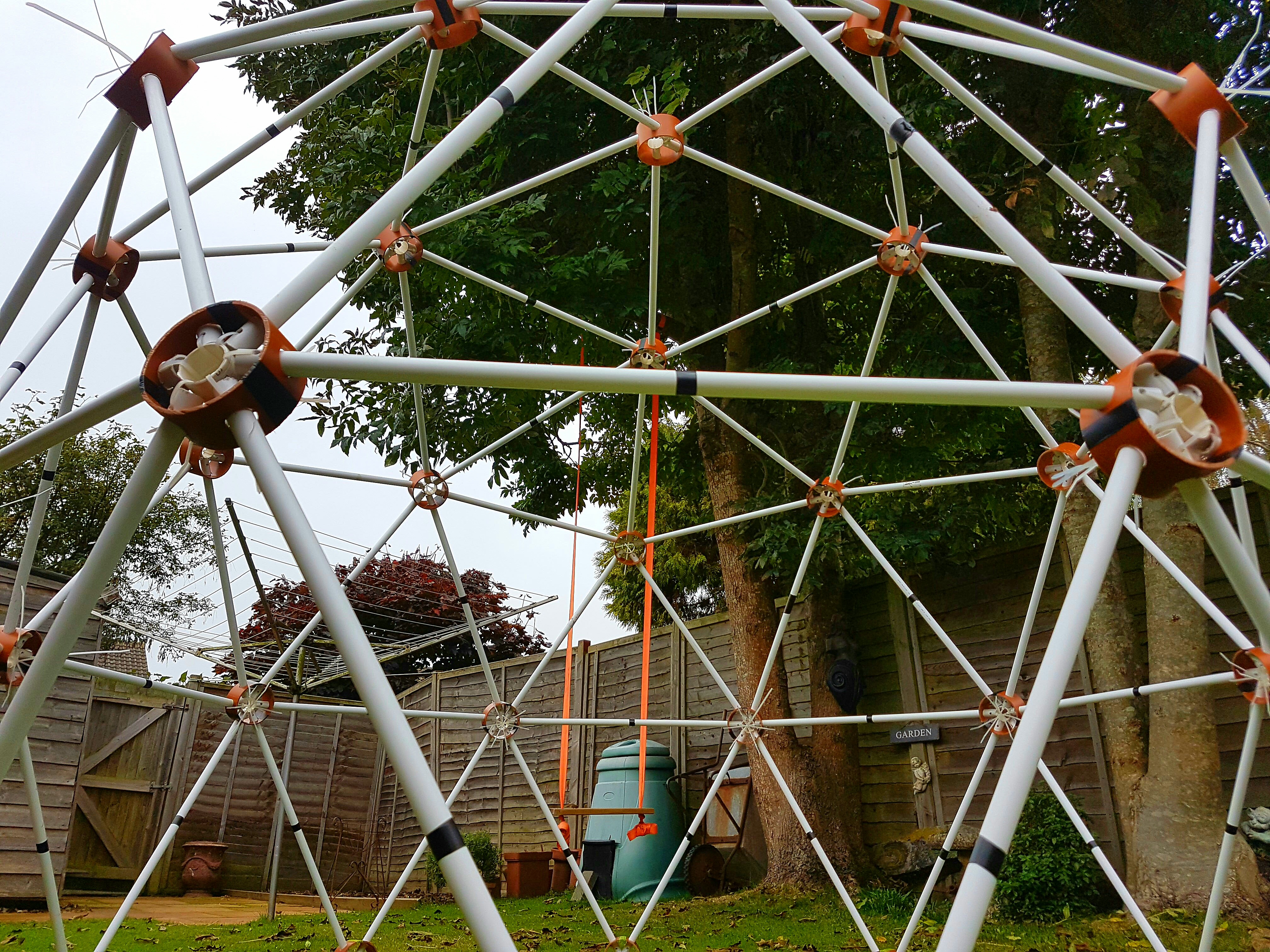 Finally I bit the built and bought some steel conduit, was really wanting to re use something and give something a new funky life but this way it would a smooth build. I made my own hydraulic press to crimp both ends and a pillar drill for fixings.. I had my own workshop going now and hibernated away over winter making it. when summer came me and Bubble Boy went an put it up.