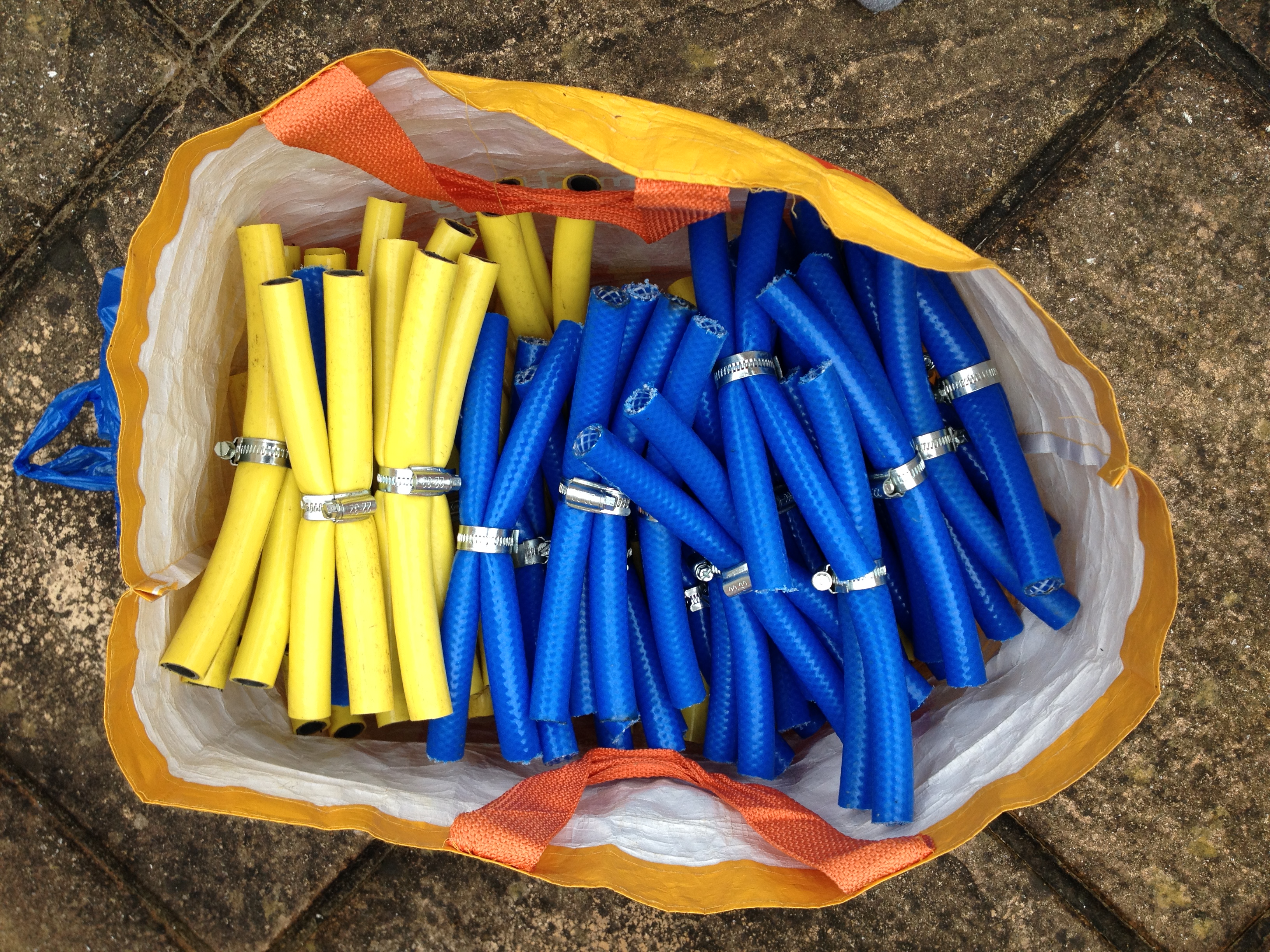 For Design No.2 I used bamboo canes for poles and hose off cuts and jubilee clips for the connectors. it failed due to it being too flexible and struggling to support it on my own. i had 2 attempts at making it work and improving it and both made an improvement but was not there yet.