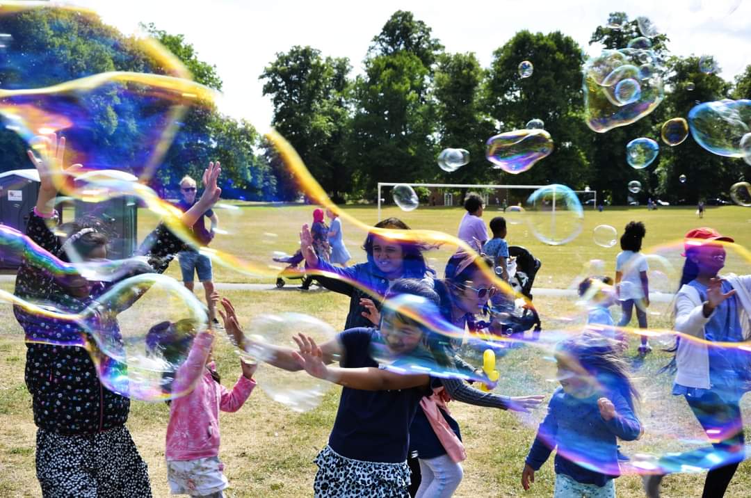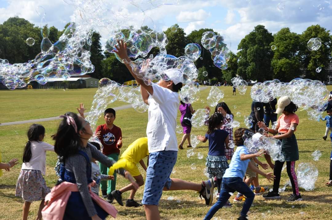 The show went well. The blizzards of billions upon billions of bubbles took flight across the park and swarmed around the whole event. The children were amazing and kept chanting for bath time. what on earth!!!! No child likes bath time!!!