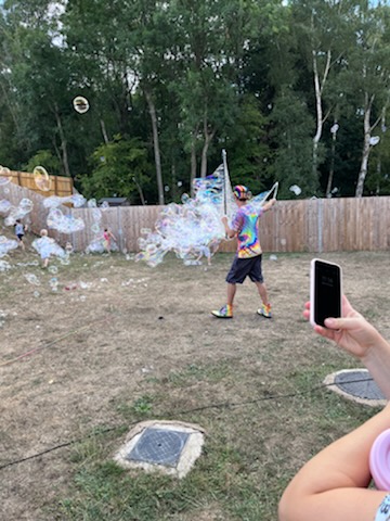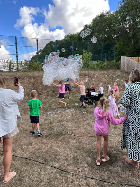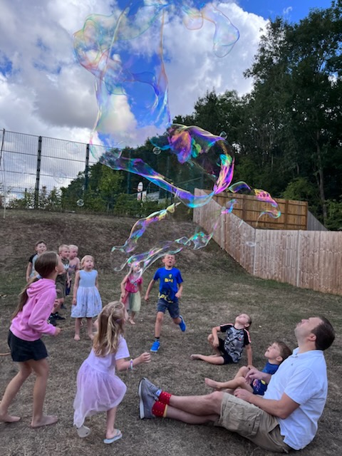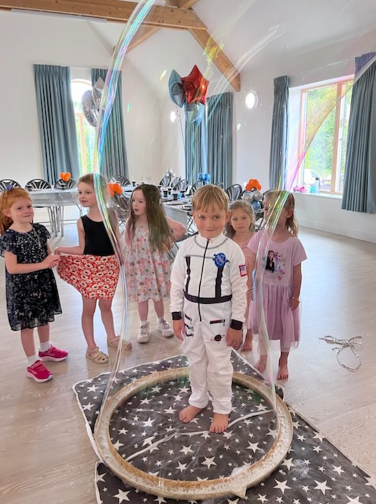 This was a lovely 5th birthday party. All the children listened and played nicely. The adults enjoyed a moments peace and could chat amongst themselves at the back and watch the chaos going on. The kids swamped me but they were very good and gave me a good distance to form them. I handed out some party hats and that went down really well, it added a nice twist to popping them. we then went inside and every child had a go going inside one. The birthday boy definitely had the best outfit!