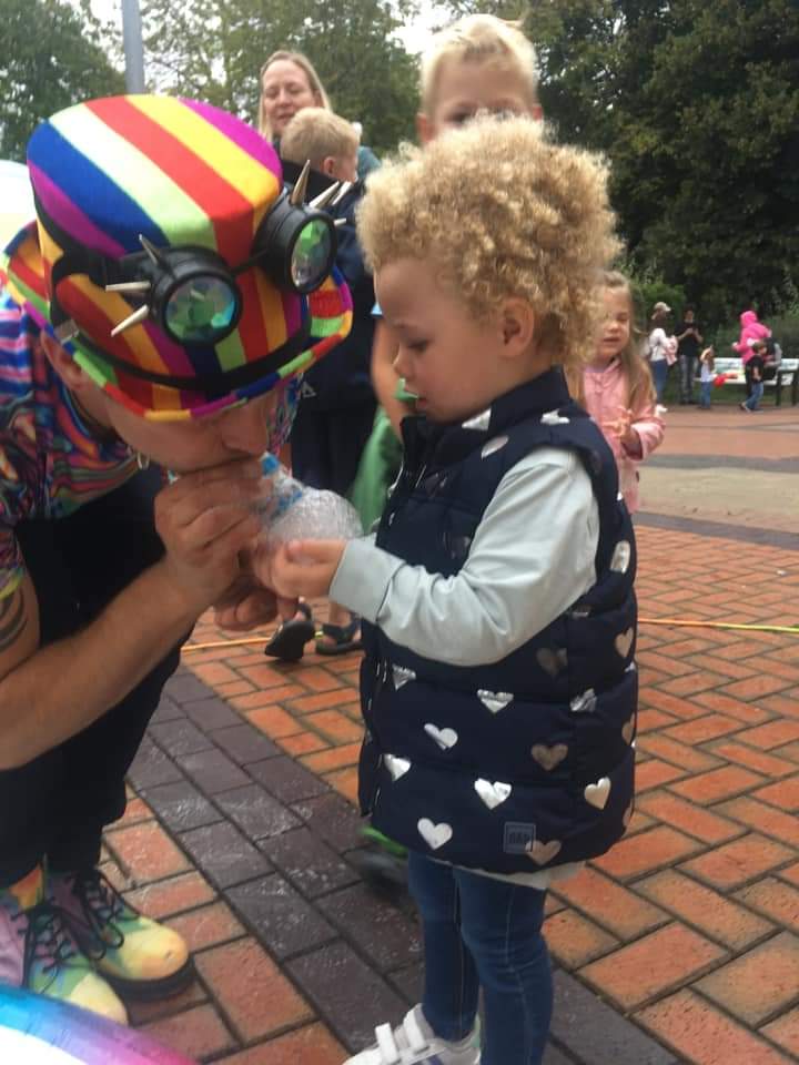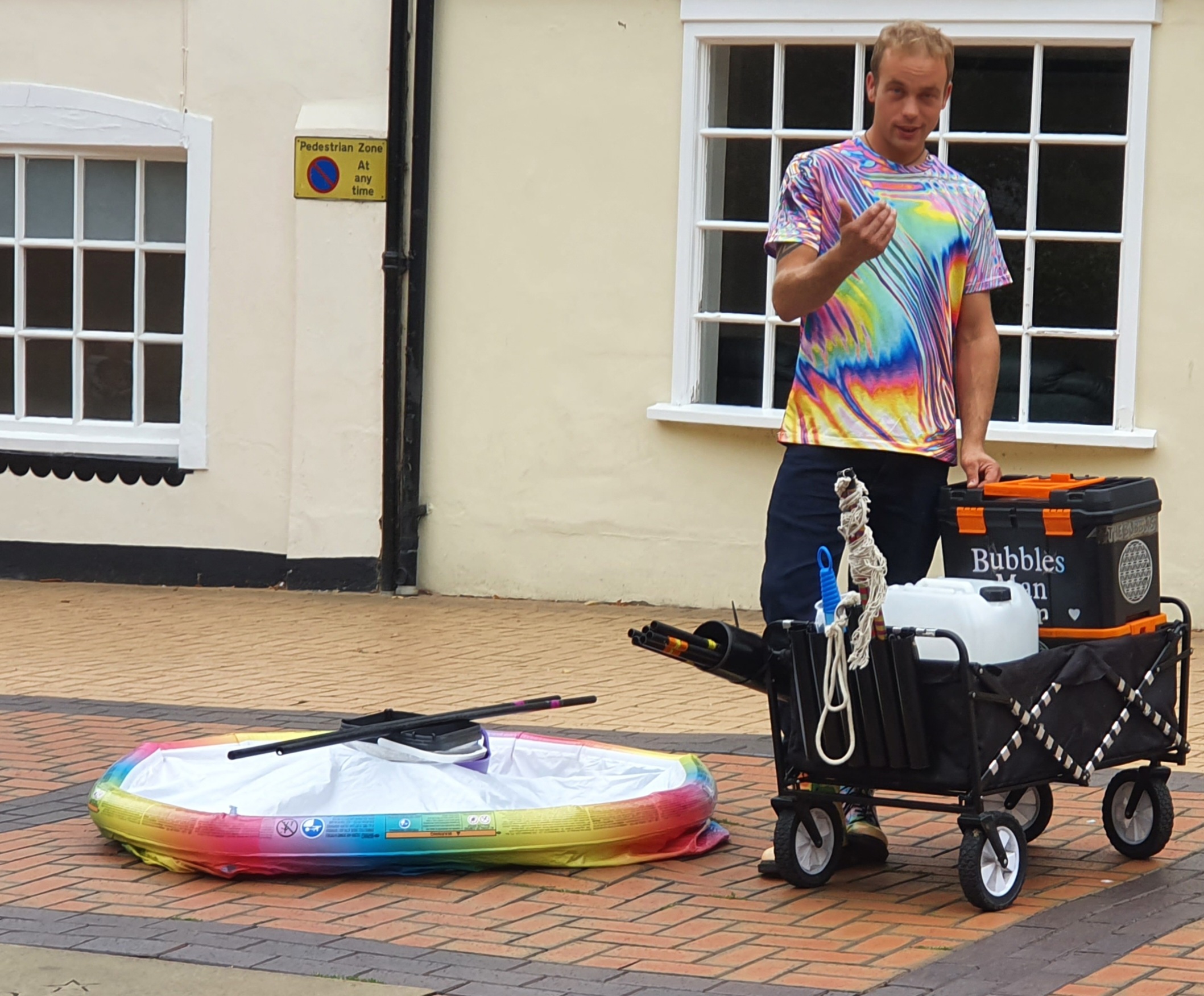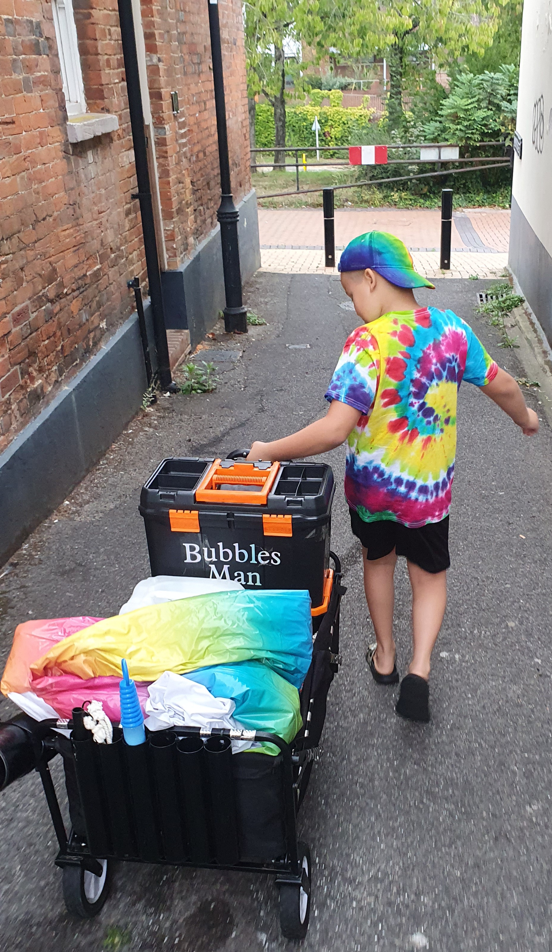 The owner got in touch with me after hearing about the busking in Basingstoke I did last year. We agreed on 2 weekends to trial it again. They went very well. Ques out the door and the coffee couldn’t be poured quick enough! My bucket didn’t rattle much but I made a lot of people smile and that’s what really counts. Bubble boy joined me on the first show, He’d made his very own tie-dye T-shirt and hat especially for the occasion. Mid way through the show he got his bubble gun out and went to the smaller children or baby’s and blew the bubbles around them so they could enjoy them too. Here are the photos from the shows.