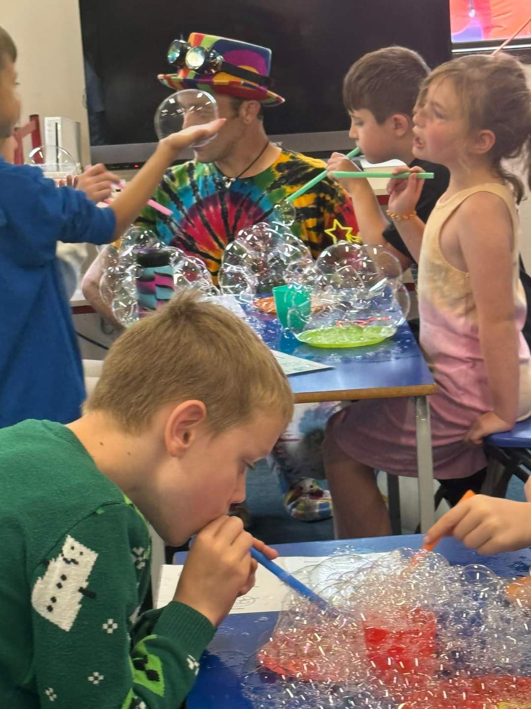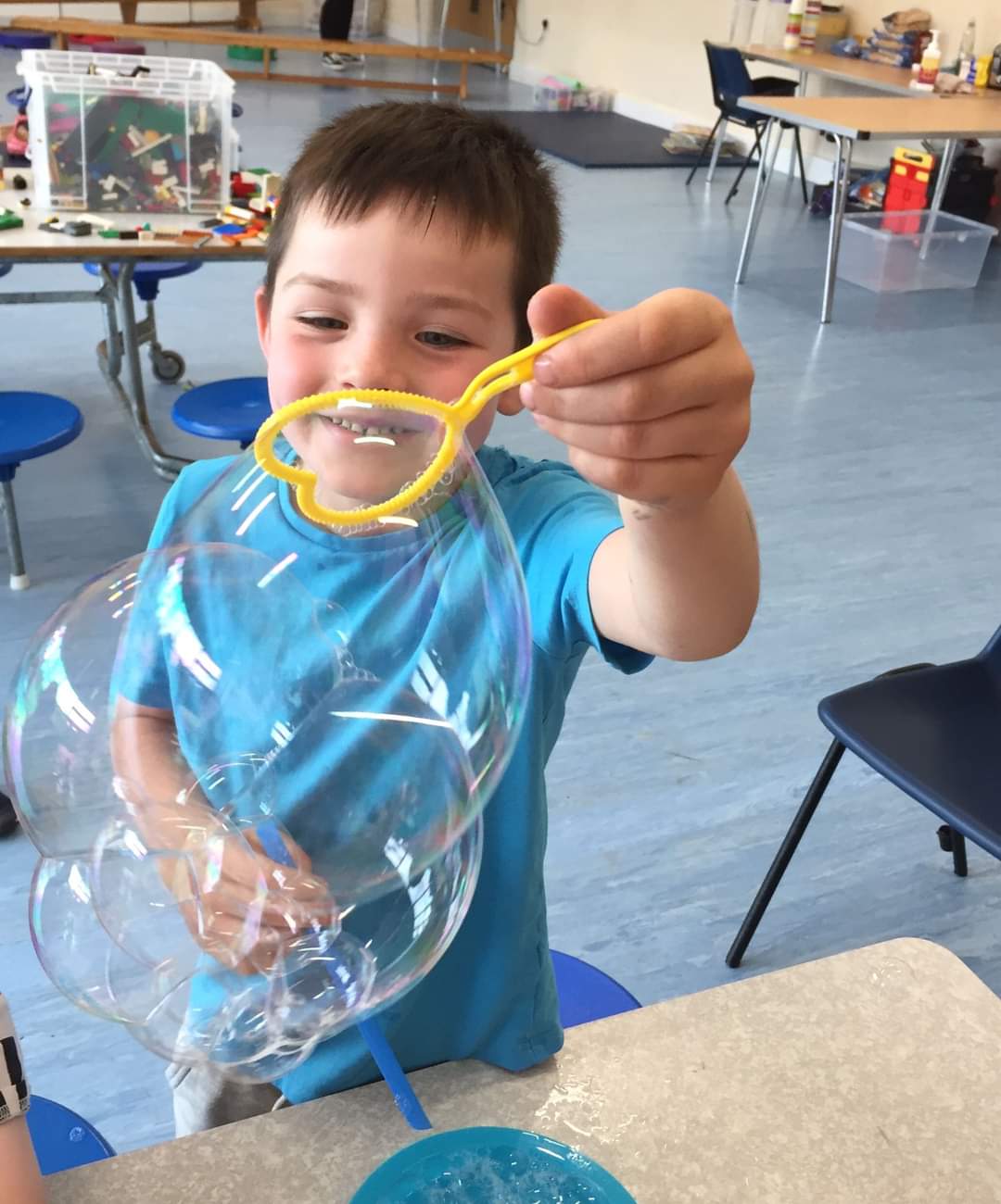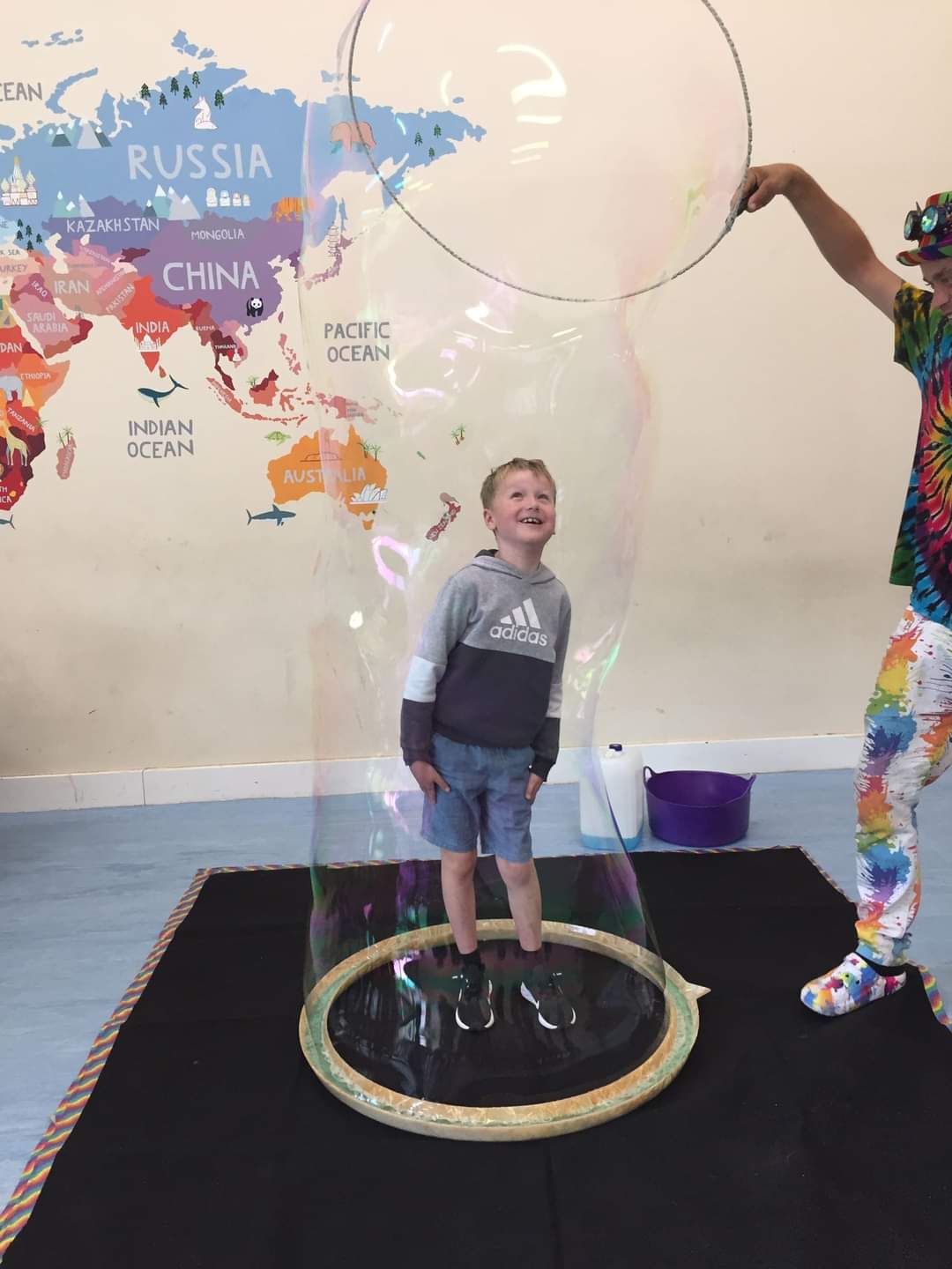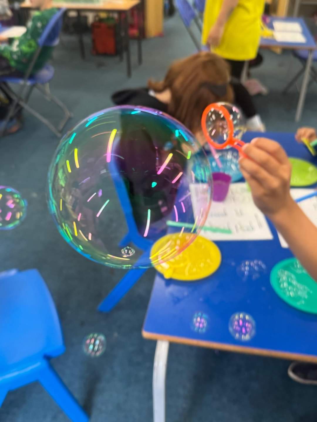 In this visit to the club all the children had a go at doing their own bubble tricks. they made caterpillar’s, blew bubbles inside of bubbles, made honeycomb and then a beehive.