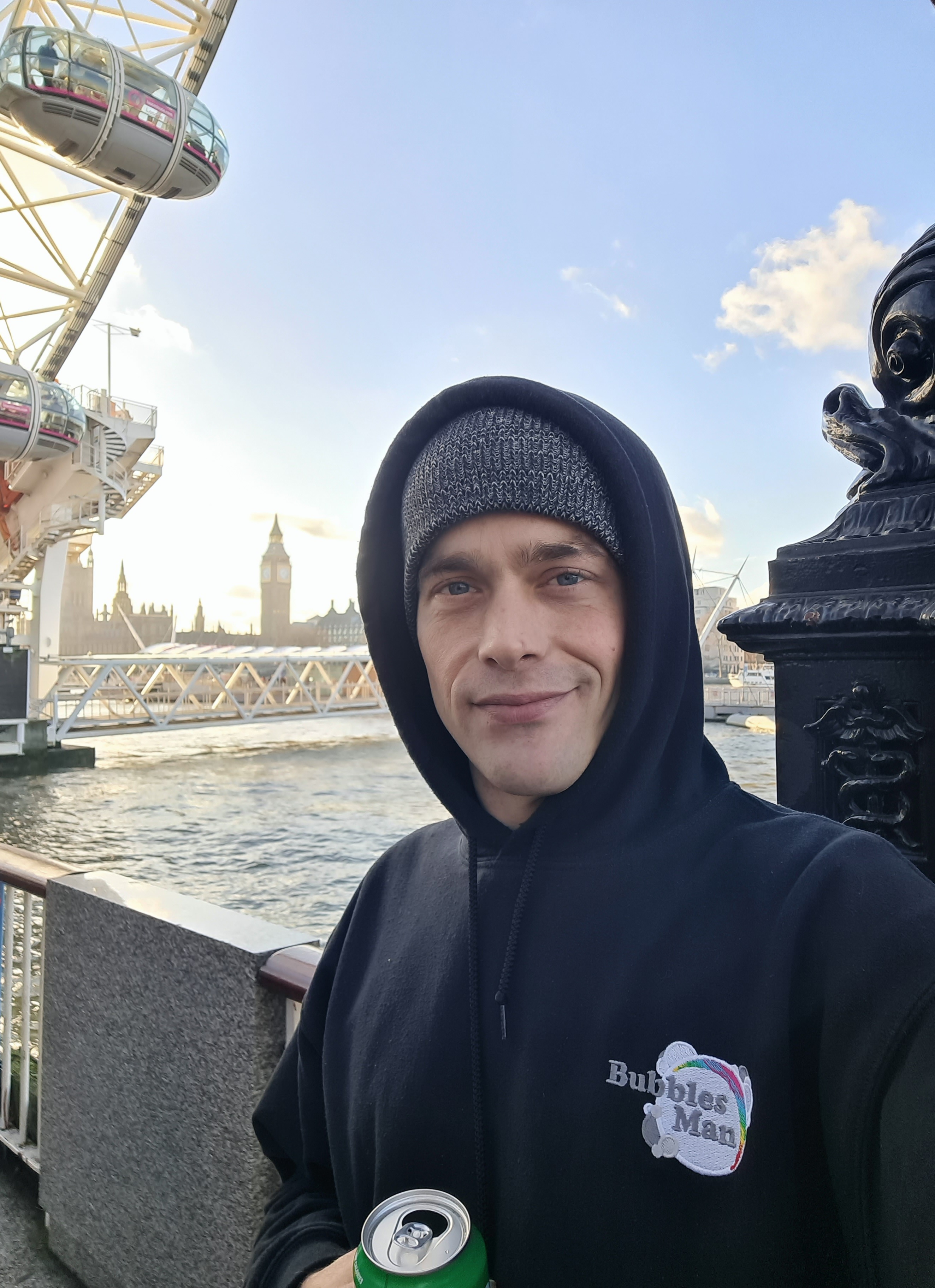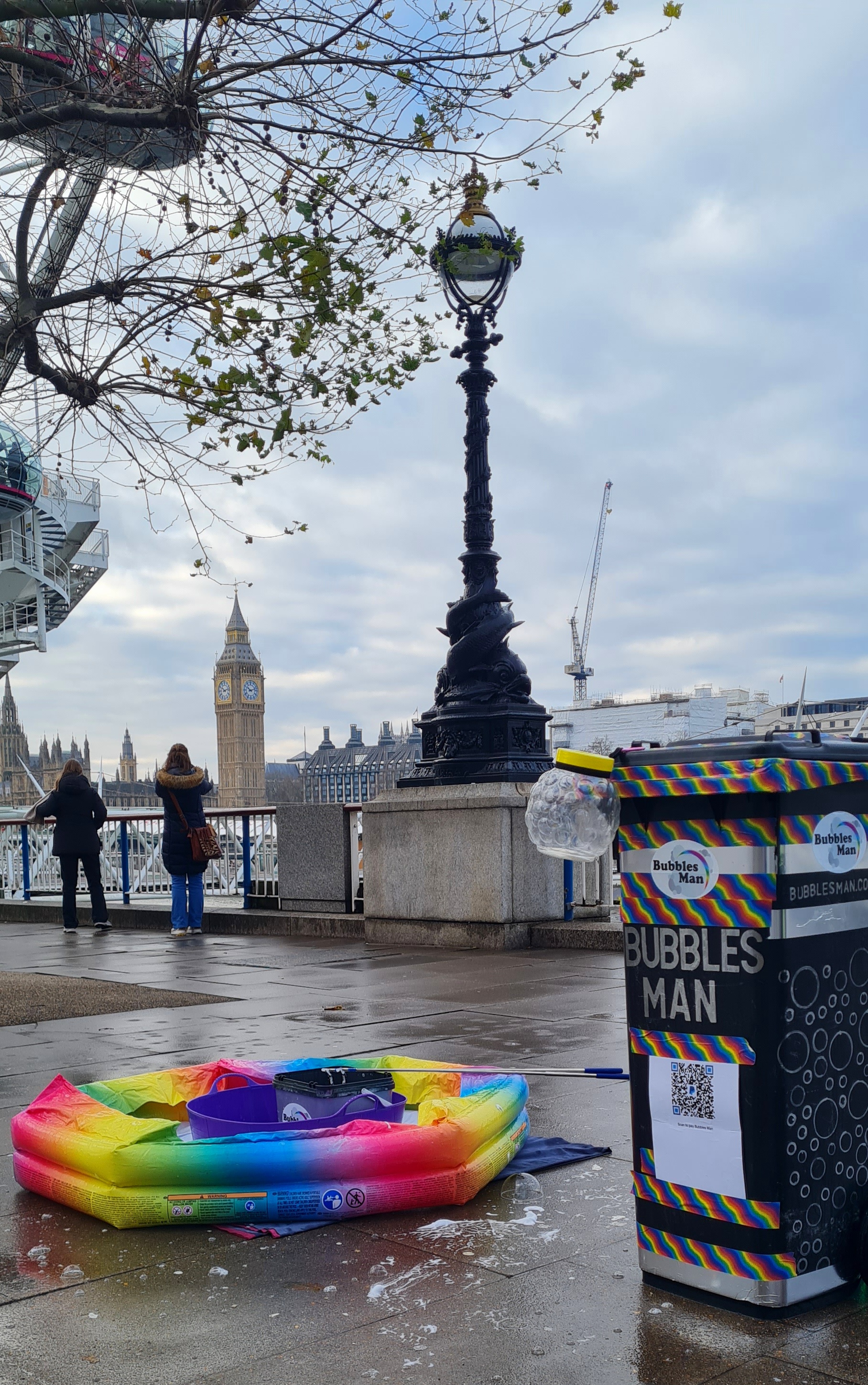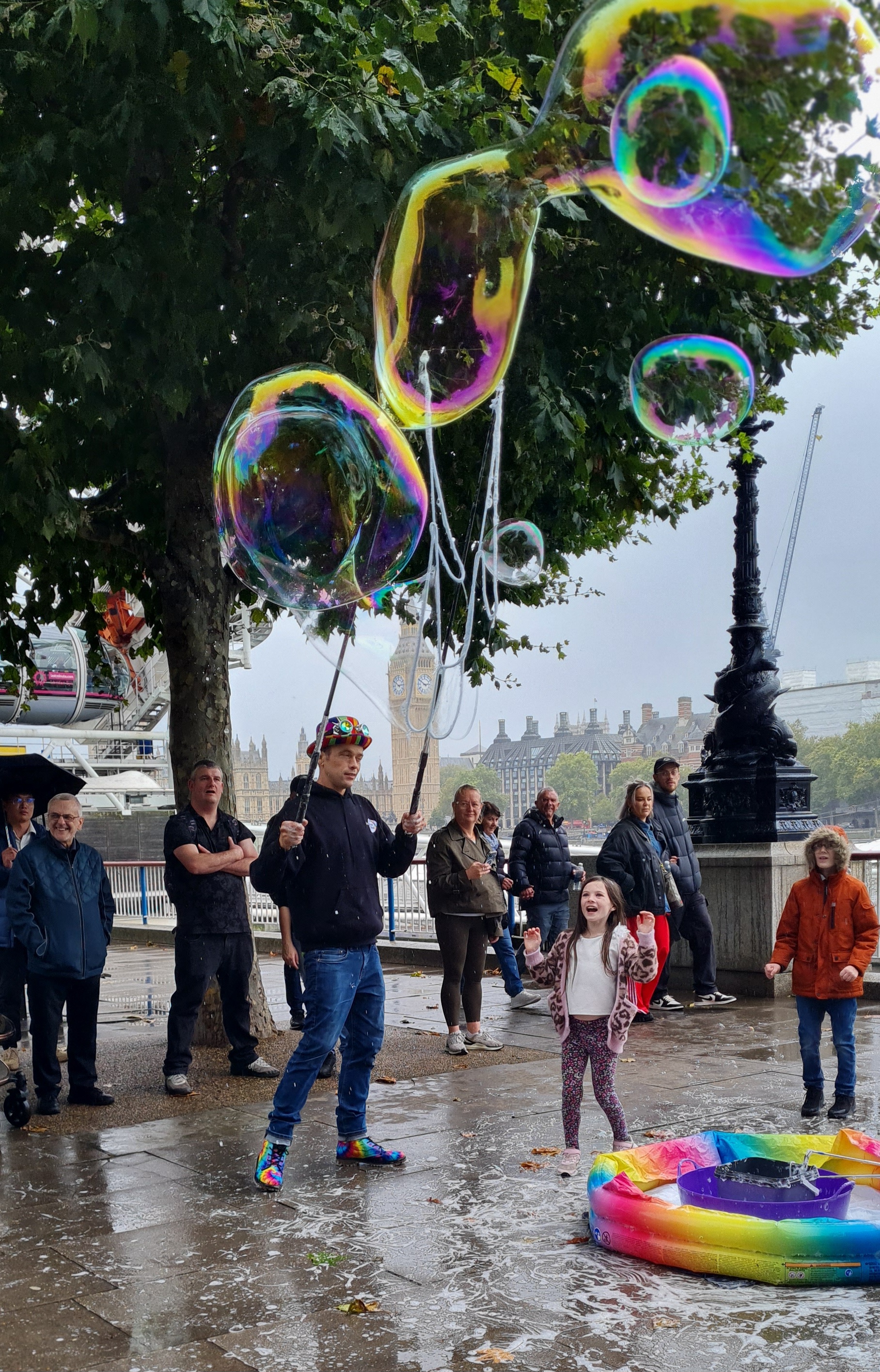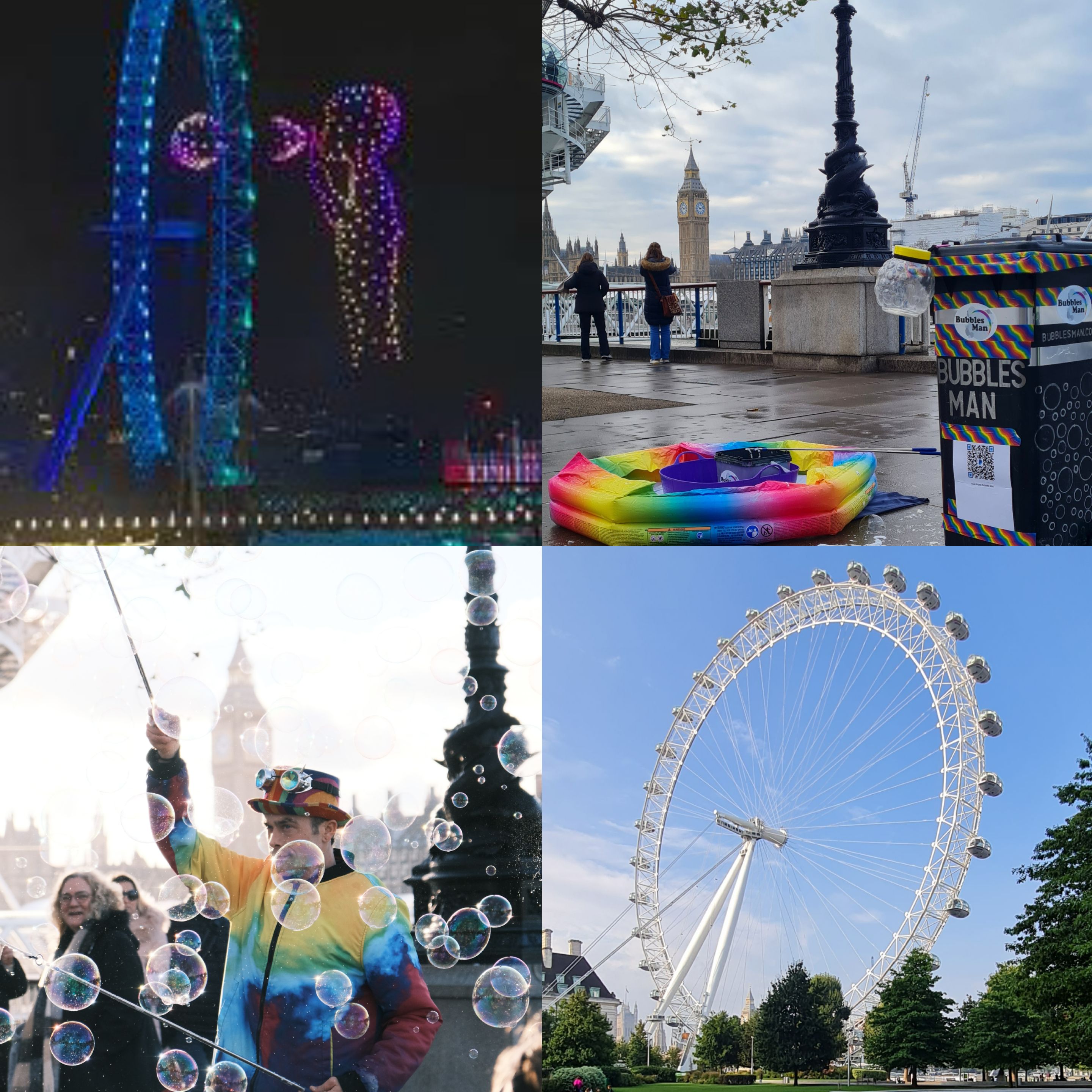 I’m still getting used to performing along The Queen’s Walk in London for the Southbank Centre. Traveling with kit has been a learning curve along with the constant change in audience. The upcycled wheelie bin works great. Being on a budget and carrying a lot of wet kit is heavy and awkward. It solved my problem perfectly. Having used one before for moving geodesic dome tent poles around I had one in the back of the garage. I have lots of ideas about how to improve my performance. This weekend was my worst in pocket money donations but it was the most fun! having two old friends come up to me and say hello or getting a photo of me while having a family day out and trip up the London Eye makes it even more special. I also got sent some great photos by one of the many people taking pictures. It really warms my heart making so many people smile! I’m not in it for the money, the reward is having fun and spreading joy. We all forget that the simple things in life are free and making memories is better then wasting away. I love making a difference to peoples lives! Having Big Ben and the London Eye as my Backdrop is Magical. You don’t need to be in a position of power to make the world a better place, we all make it beautiful!