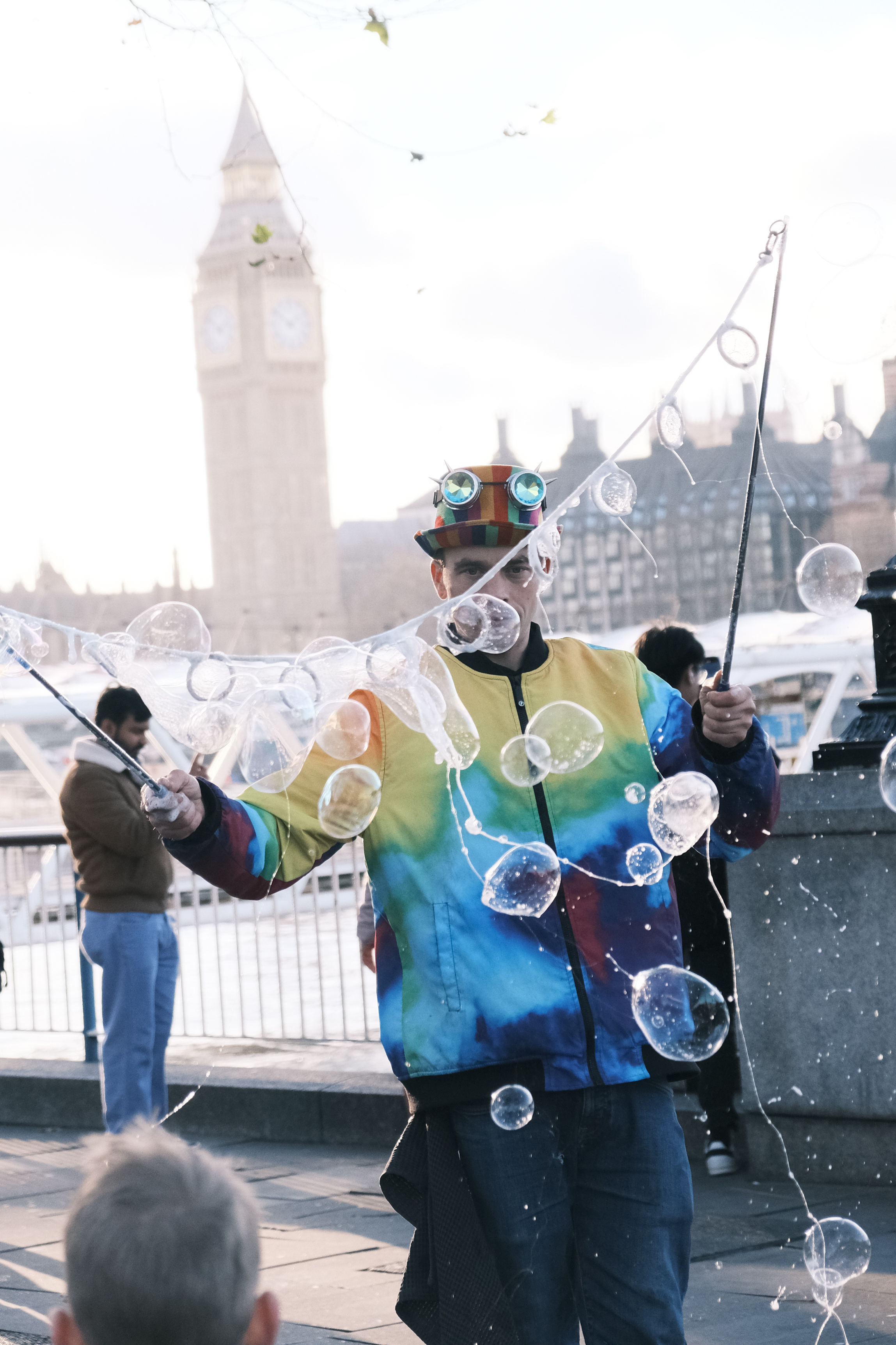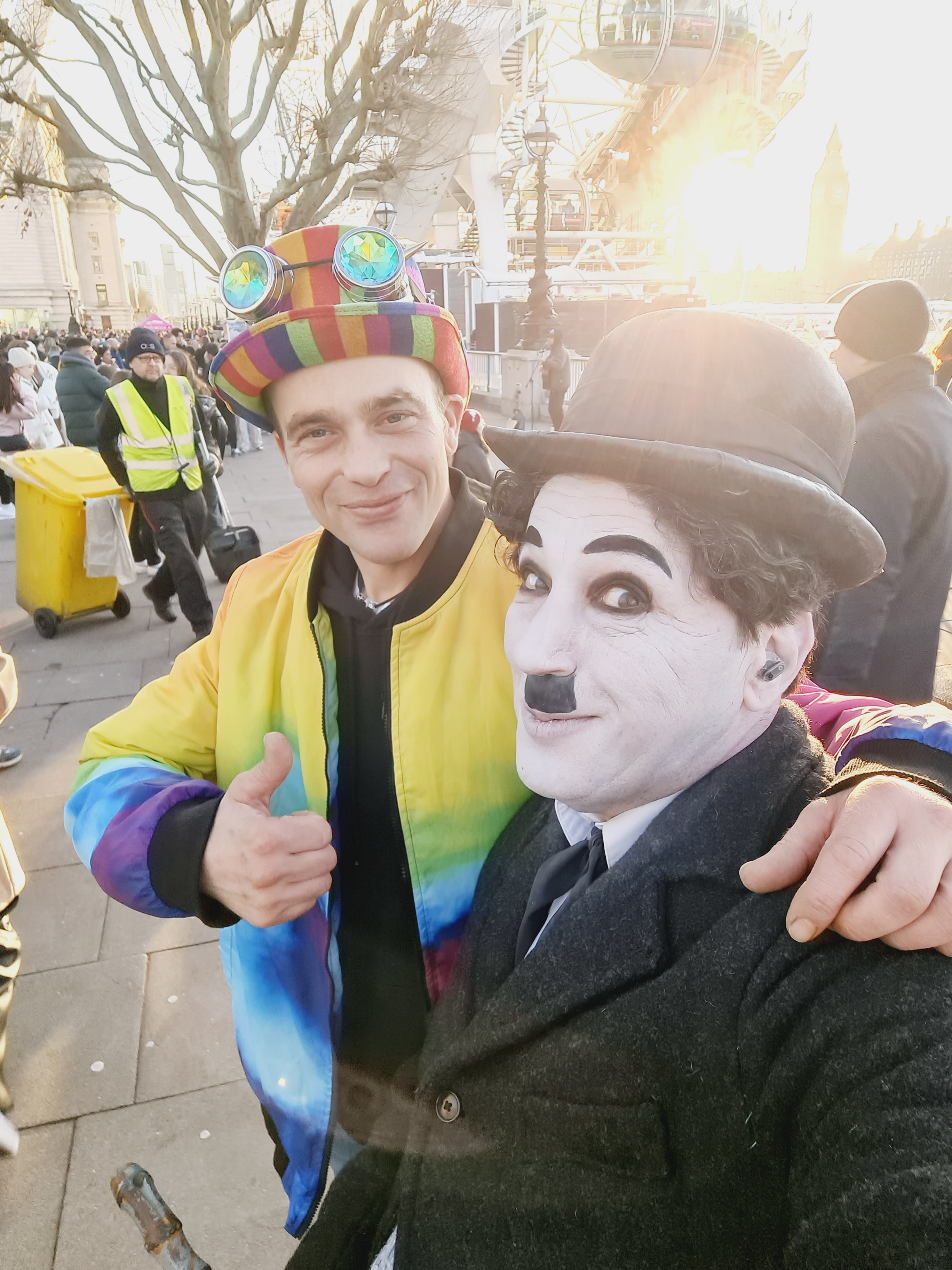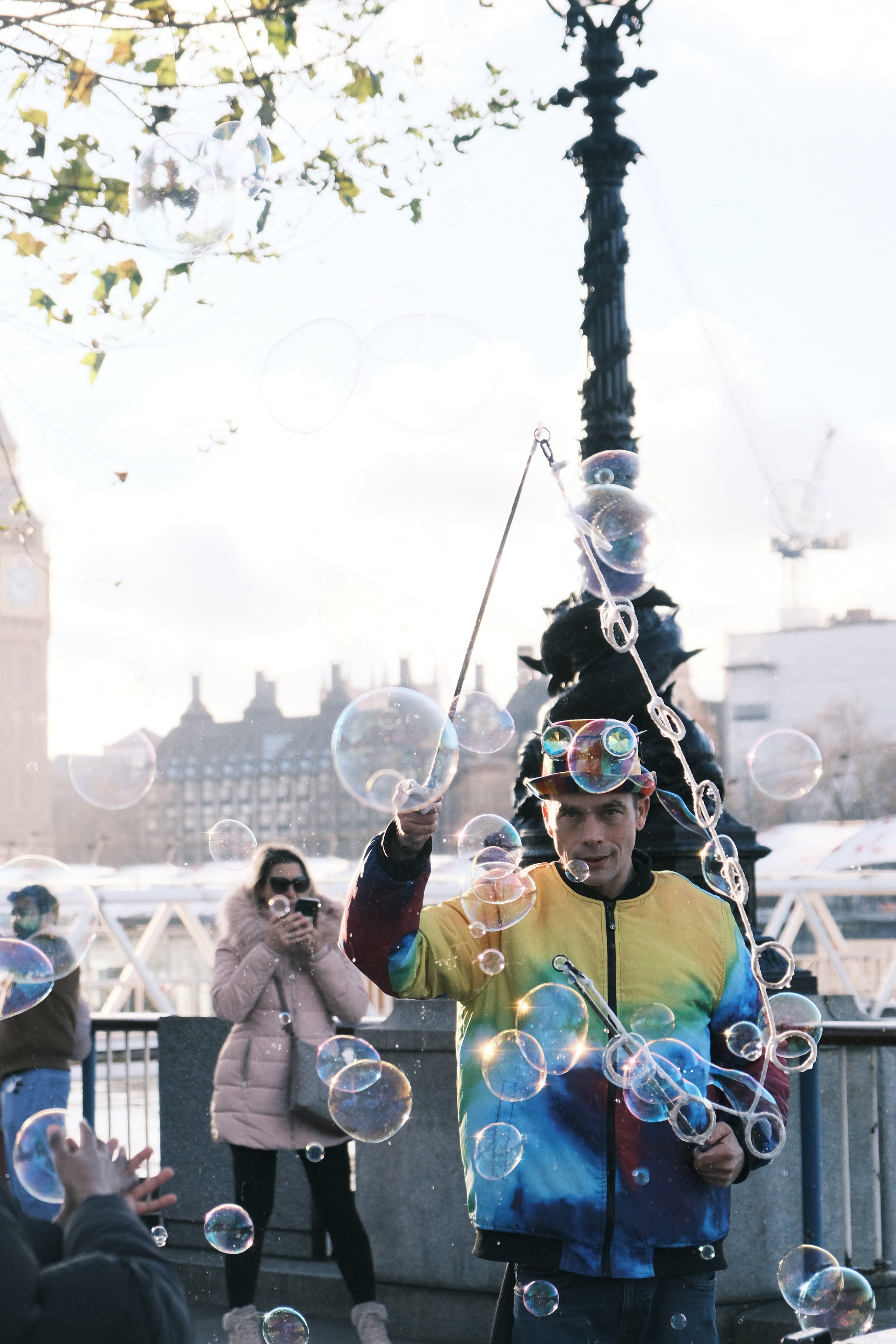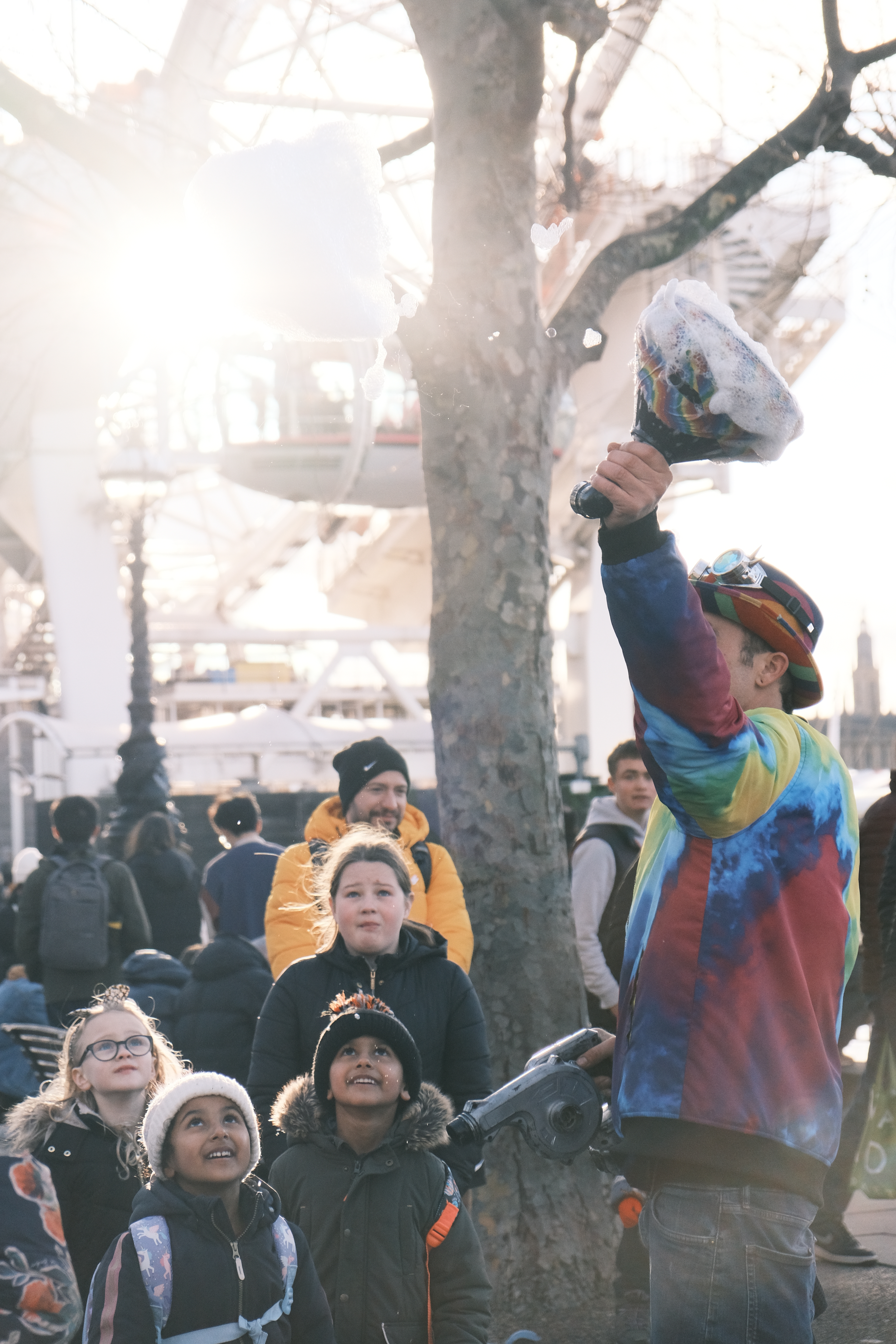 I’m still getting used to performing along The Queen’s Walk in London for the Southbank Centre. Traveling with kit has been a learning curve along with the constant change in audience. The upcycled wheelie bin works great. Being on a budget and carrying a lot of wet kit is heavy and awkward. It solved my problem perfectly. Having used one before for moving geodesic dome tent poles around I had one in the back of the garage. I have lots of ideas about how to improve my performance. This weekend was my worst in pocket money donations but it was the most fun! having two old friends come up to me and say hello or getting a photo of me while having a family day out and trip up the London Eye makes it even more special. I also got sent some great photos by one of the many people taking pictures. It really warms my heart making so many people smile! I’m not in it for the money, the reward is having fun and spreading joy. We all forget that the simple things in life are free and making memories is better then wasting away. I love making a difference to peoples lives! Having Big Ben and the London Eye as my Backdrop is Magical. You don’t need to be in a position of power to make the world a better place, we all make it beautiful!
