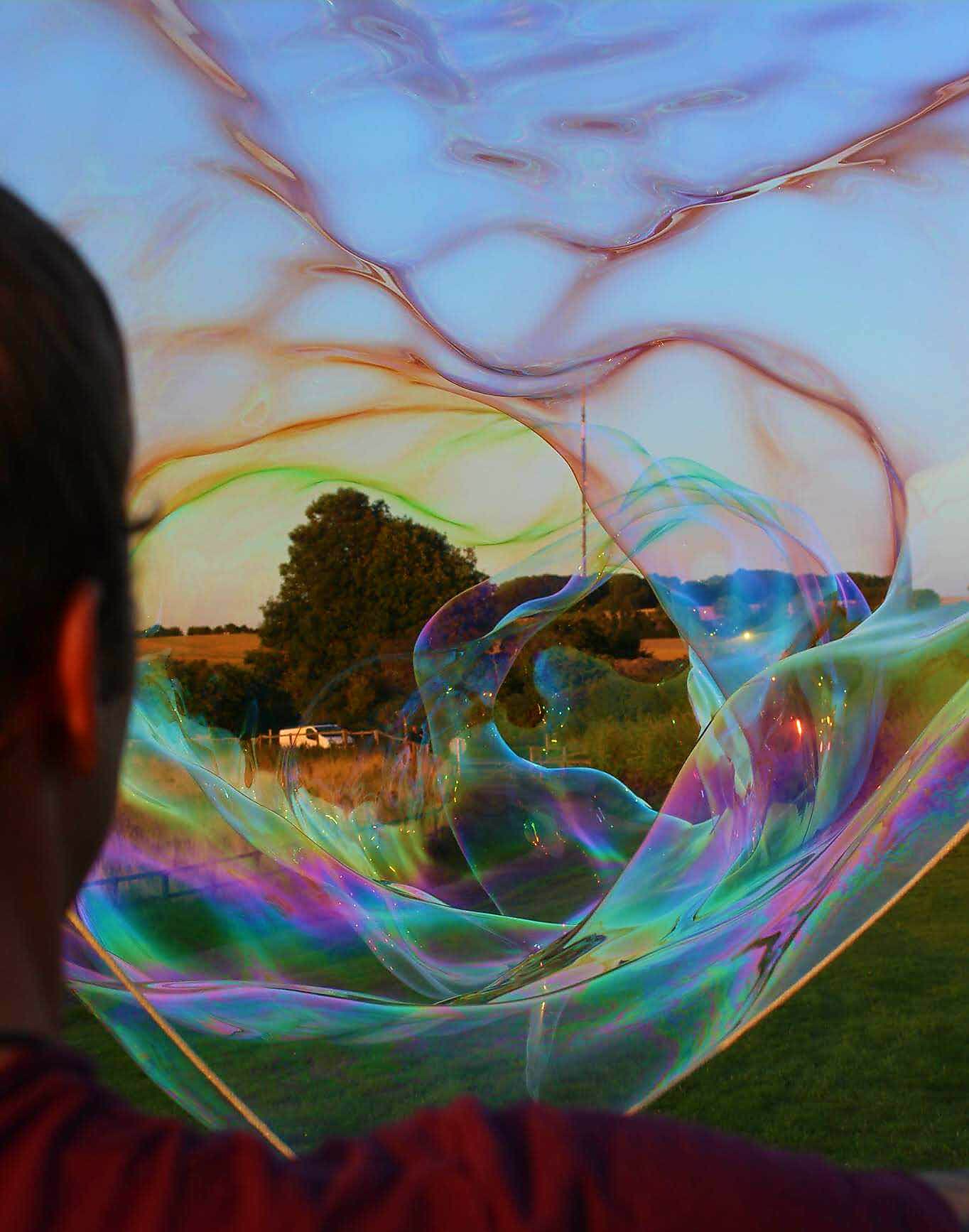 The fascination of bubbles and science behind them I have enjoyed for many years, the range of colour and beauty in a floating bubble with it morphing and twisting and yet holding together with it’s own chemical chaos going around on its surface the colors mix and abstract the view. The reflections and sparkle of light and in an instant its gone! No bubble is ever the same, Every moment is special!